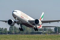 Een Boeing 777-200 vrachtvliegtuig van Emirates SkyCargo stijgt op van de Polderbaan bij Schiphol.