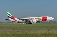 Landing van een Boeing 777F van Emirates Skycargo (A6-EFL) op de Polderbaan. Het toestel is voorzien van de Red Rose livery.