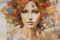 Emma Portret - abstract schilderij / mixed media kunst geschilderd. Mooi contrast tussen het verfijnde portret en rauwe collage/schildertechniek.