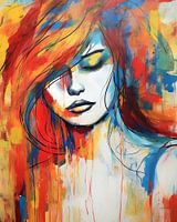 Kleurrijk mixed media portret van een vrouw met een mix van verf en lijntekening op grof papier.
