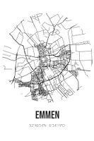 Zwart-witte landkaart, stratenplan of plattegrond van Emmen. Emmen is gelegen in de gemeente Emmen, provincie Drenthe. Op de stadskaart zijn alle openbare wegen in Emmen opgenomen. Verder is de kaart voorzien van de coördinaten van het centrum van Emmen.