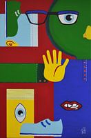 Schilderij van een Emoji met de kleuren blauw, groen, geel en rood. Alle lichaamsdelen zitten op de verkeerde plaats
