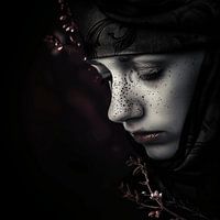 Dit zwart wit portret op een donkere achtergrond laat een jonge dame zien met neerkijkende blik vol emotie.
