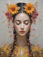 Ontdek "Elegantie," een adembenemend digitaal kunstwerk gecreëerd met olieverf. Dit betoverende portret toont een knappe, elegante jonge vrouw met gesloten ogen, gehuld in een aura van mysterie. Haar hoofd wordt gesierd door een delicate bloemenkrans, uitgevoerd in de rijke, klassieke kleuren van de oude meesters.
