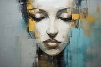 Abstract beeld van een emotionele vrouw met gesloten ogen. Licht turkoois en donker goud met kubistische fragmentatie, in de stijl van een realistisch olieverfportret.