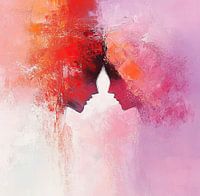 Emotioneel Abstract - Dit abstracte schilderij toont een energieke vermenging van roze en rode verf, waarin de subtiele contouren van een menselijk gezicht te onderscheiden zijn, omgeven door sterk uitgeveegde en gespatte verftechnieken die zowel dynamiek als emotie oproepen.