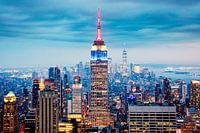 Op deze fascinerende foto van de adembenemende skyline van New York City, genomen tijdens het magische Blauwe Uur, staat het in felle kleuren verlichte Empire State Building in het middelpunt van de belangstelling. Zijn majestueuze gestalte torent trots uit in de blauwgloeiende avondlucht en domineert het tafereel met zijn roodgloeiende bovenkant, die schittert als een fonkelende diamant in de duisternis van de avond.