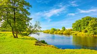 De Ems in de zomer. Met groene weiden en bomen langs de oevers. De foto is genomen tijdens de mars bij Meppen.