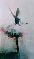 A Ballet of Ethereal Beauty. Dynamisch en dromerige afbeelding van een balletdanseres in de kleurtinten roze, groen, emerald. Mysieke olieverfschildering die veel aan de verbeelding overlaat, echter de beweging en elegantie wordt duidelijk verbeeld. dunne lijnen over haar jurk maken het nog meer bijzonder. Passend bij diverse stijlen en trends, waaronder modern abstract, romantiek, naturel. Artist: Bianca ter Riet