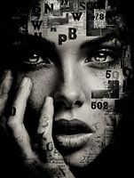 In deze mixed media collage komen menselijkheid en data samen: een vrouwelijk gezicht, opgebouwd uit tekens, cijfers, flarden krant en stilte.
