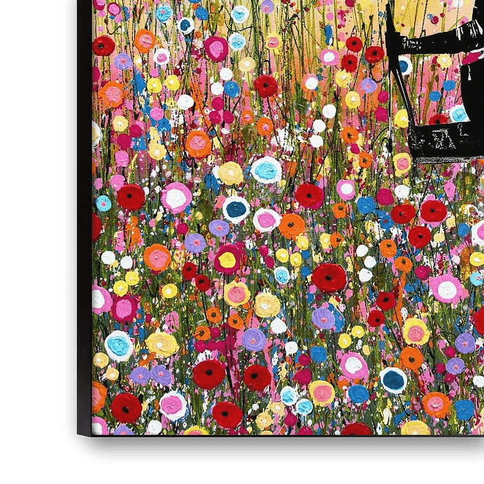 Zomerse afbeelding van een vrouw schommelend in een prachtig bloemenveld van kleurrijke bloemen. Rood, paars, roze, geel aquablauw, groen, oranje, wit. Vrolijk en vrij. Passend bij diverse trends en stijlen. Artist: Bianca ter Riet.