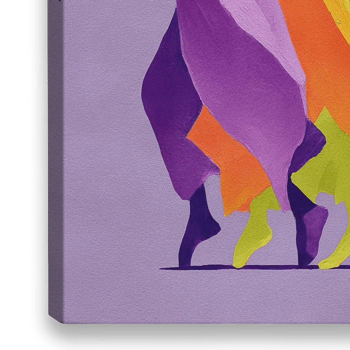 Energetic Harmony in Motion - Dit dynamische dans schilderij toont drie abstracte figuren in levendige kleuren zoals paars, oranje en geel, die samen een gevoel van beweging en energie uitstralen tegen een zachte paarse achtergrond.