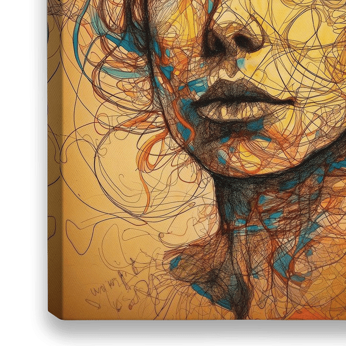 Een portret van een vrouwengezicht weergegeven in een levendige en expressieve stijl. Haar gelaatstrekken worden gedefinieerd door een complex netwerk van lijnen met een mix van aardse tinten. Haar ogen, hoewel enigszins verhuld door de artistieke interpretatie, stralen een gevoel van introspectie uit. De algehele indruk is er een van…