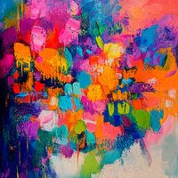 Een abstract kunstwerk met een explosie van kleuren, met dikke penseelstreken, levendige en heldere tinten en een paletmes-stijl. Dit kunstwerk straalt energie en opwinding uit en trekt je aandacht door de dynamische impressionistische compositie en het levendige palet.