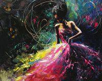Energie | Dance of Colorful Whispers - Dit vrouwen schilderij toont een etherische gestalte in een kleurrijke, abstracte baljurk, omgeven door een dynamisch palet van neon lijnen en expressieve verfklodders die beweging en energie suggereren.