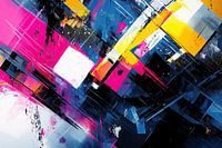 Een abstract, dynamisch schilderij met krachtige, vegende penseelstreken en levendige kleuren. Gelaagde texturen en energieke lijnen ontmoeten hoekige vormen, waardoor diepte ontstaat en tegelijkertijd chaos en harmonie worden overgebracht. Dikke, getextureerde kleurentoepassingen geven het werk rauwe energie en spontaniteit.