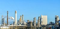 Energiecentrale Maasvlakte 3 in de Rotterdamse haven met buizen en schoorstenen en een helderblauwe lucht op de achtergrond. De zeer efficiënte centrale heeft een vermogen van 1.070 MW.
