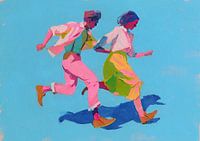 Energiek Paar - Dit is een schilderij van een energiek paar dat hand in hand rent, met een heldere aquamarijn achtergrond en levendige kleuren zoals roze, geel en groen die hun vrolijke beweging accentueren.