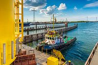 Een krachtige compositie: een sleepboot trekt een ponton door het sluizencomplex van Hansweert. Imposante gele ‘transition pieces’ staan opgesteld op het ponton. Het zijn funderingselementen voor offshore windmolenparken.