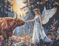 Een engel bezoekt een schotse hooglander in het bos. Nieuwsgierig steekt de hooglander zijn snuit op naar de hand van de engel. De zon schijnt haar zonnestralen op dit magische tafereel.