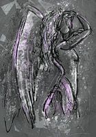 Dit abstracte kunstwerk is uitgevoerd met grijs roze en witte accenten. Je ziet een engel van de zijkant, haar rechter hand heeft ze in haar haren. Dit werk is een digitale bewerking van een pentekening op papier. Het werk heeft door het kleurgebruik en de grove zwarte lijnen een stoer karakter. Het kunstwerk heeft een staand formaat.…