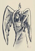 Houtskool tekening van een engel. Deze engel heeft haar rechter hand in de lucht en haar linker hand op haar haren. Haar vleugels wijzen omlaag. Ze heeft een droevige blik in haar ogen. Een spiritueel kunstwerk dat kalmte en rust ademt.