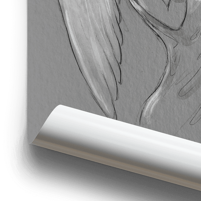 Prachtige engel in semi abstracte stijl getekend. Deze digitale bewerking van een handgetekende potlood tekening is uitgevoerd in grijs tinten. De witte accenten geven dit werk de look and feel van een krijttekening.