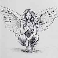 Deze inkt tekening van een engel is gemaakt in zwart wit en grijs tinten. De tekening is digitaal geoptimaliseerd met een olieverf filter in photoshop. Hierdoor heeft de tekening een fijne structuur gekregen. Deze structuur komt het best naar voren op artframe. Deze engel zit op haar hurken en heeft prachtige lange krullende haren.