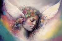 Engel met gesloten ogen, bloemen in het haar. Omgeven door kleuren van een liefhebbende aura. In gedachten? Kijkend naar de wereld? Dromend over een mooiere wereld?