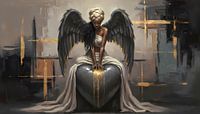 Een engel zit op een groot zilveren hart. Stijlvol schilderij met veel contrast en diepte.