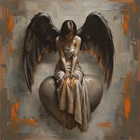 Een engel op zit op een 3D hart. Olieverf schilderij gemaakt met AI op basis van een handgetekende schets.