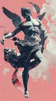 De figuur heeft een goddelijke en klassieke uitstraling, met een gespierd lichaam en een dramatisch wapperend gewaad dat lijkt te dansen in de wind. De vleugels suggereren een engelachtige of mythologische oorsprong, mogelijk geïnspireerd door figuren als Icarus of Hermes. De subtiele lichtinval en schaduw geven de sculptuur een bijna levende uitstraling, terwijl de moderne, grafische kleuraccenten zorgen voor een eigentijdse interpretatie van een klassiek beeldhouwwerk.