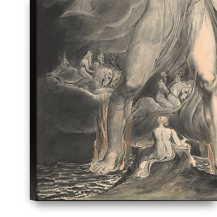 De engel van de Openbaring is een krachtig en visionair werk van de Engelse kunstenaar en dichter William Blake. Deze handgekleurde prent, die deel uitmaakt van zijn serie illustraties voor de Bijbel, toont een scène uit het Boek Openbaring, waarin een "machtige engel" neerdaalt uit de hemel.