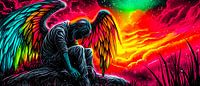 Deze adembenemende foto toont een engel in een moment van diepe reflectie en melancholie. De engel zit op een rots, hoofd gebogen, vleugels wijd uitgespreid, terwijl een indrukwekkende explosie van kleuren de hemel verlicht. Zijn vleugels zijn bezaaid met heldere regenboogkleuren, van levendige turquoise en groene tinten tot helder geel en rood, die perfect contrasteren met de donkere lijnen van zijn silhouet.