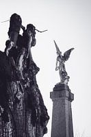 Een vrouwenbeeld met uitgestrekte engelenvleugels staat centraal, vastgelegd in zwart-wit. Het contrast tussen licht en schaduw benadrukt de vormen en details van het beeld, waardoor de vleugels een gevoel van gewicht en eerbied uitstralen. De achtergrond is vaag, waardoor alle aandacht naar het beeld gaat en het een serene, plechtige…