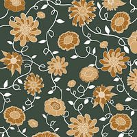 Een moderne twist aan een klassiek Engels patroon. Bloemen en oker bladeren wisselen elkaar af op een donker groene achtergrond.