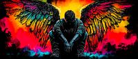Dit indrukwekkende werk toont een engel die opgaat in een dramatische scène van reflectie en stilte. Het silhouet van de engel, gekleed in moderne, donkere kleding, straalt een mysterieuze en peinzende stemming uit. De vleugels van de engel zijn afgebeeld in levendige regenboogkleuren, variërend van sterk blauw tot helder geel en diep rood. Deze kleuren lijken in schril contrast te staan met zijn eerder sombere, introverte houding.