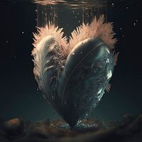 Een engelenhart, onder water, in het licht. Veren en veertjes zichtbaar. Schatten van de zee. De onderwaterwereld toont haar geheimen.