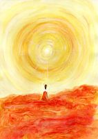 Deze aquarel laat de engel in warme tinten in het licht kijken. Kijk vooruit.