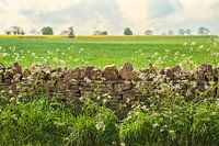 Dit Engels landschap is gefotografeerd in The Cotswolds. Een karakteristiek gestapeld stenen muurtje met witte wilde bloemen op de voorgrond. In de verte een geel veld met Koolzaadbloemen.