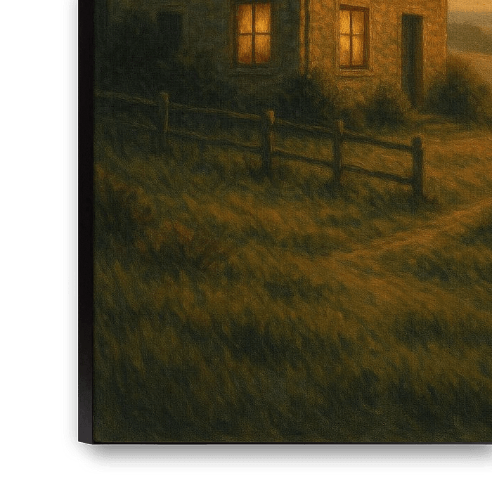 Oxfordshire Sunset Serenity toont het pastorale hart van Engeland dat baadt in een gouden schemering. Glooiende velden strekken zich uit tot aan een horizon die is gekleurd met amber en sering, terwijl een kleine boerderij en een kronkelend laantje rusten in zachte stilte. Dit op Edward Hopper geïnspireerde schilderij vangt landelijke stilte niet als leegte maar als emotionele ruimte - een pauze tussen dag en nacht waarin het platteland zelf lijkt te ademen.