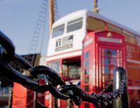 Britse telefooncel met Engelse dubbeldekkerbus in de haven van de Engelse stad Liverpool. Mooi typisch Engels tafereel met de herkenbare rode kleuren.