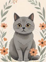 Prachtig A.I. portret van een Engelse blauwe kat tussen de bloemen. Er is gebruik gemaakt van fijne lichte pastel kleuren die ook goed passen bij het herfst seizoen.