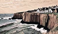 Engelse kust met kliffen, huizen en zee in retro bruin is een digitaal gemaakte illustratie. Uitvoering: liggend.