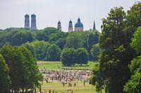 Engelse tuin met ligweide, veel mensen en torens van het stadscentrum, uitzicht vanaf de Monopteros, München, Opper-Beieren, Beieren, Duitsland