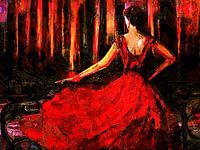 Het schilderij is gemaakt met behulp van een mix van drie verschillende olieverf technieken die digitaal zijn samengevoegd tot één nieuw werk. De achtergrond toont een abstract geschilderde skyline van de stad, terwijl de vrouw in de rode jurk met veel meer detail is geschilderd. Deze combinatie zorgt voor een interessant contrast tussen de abstracte en gedetailleerde elementen in het werk.