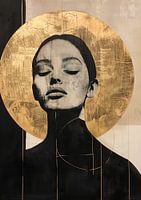 Modern abstracte afbeelding van een vrouw in zwart wit en grijs op een beige achtergrond met een gouden ronden cirkel, die de zon zou kunnen symboliseren. Daarnaast dunne gouden lijnen en een mooi complementerende vlakverdeling in beige, zand en zwart. Passend bij diverse stijlen en trends, waaronder minimalitisch, modern abstract, zwartwit. Artist: Bianca ter Riet