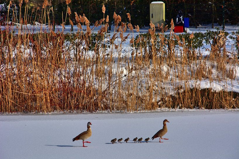 Winter op kasteel Berge in Gelsenkirchen met nijlganskuikens op de bevroren fonteinvijver