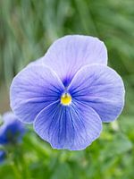 Groot paars viooltje - een prachtig groot zacht paars viooltje met een geel hart. Dit paarse viooltje werd ons geschonken op earthday. Een enkele grote vioolbloem staat centraal in deze bloemenmacrofoto. Links achter deze bloem is nog een ander viooltje te zien. De achtergrond is donkergroen en middengroen. Het is vandaag een bewolkte lentedag en de belichting is gelijkmatiger dan op een zonnige dag. Het paarse viooltje reikt naar voren en kijkt rechtstreeks naar de kijker. Het heeft een fijne textuur en het paars loopt over van heel zacht naar donkerpaars.