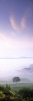 Enkele boom in de vroege ochtendmist bij zonsopgang, Toscane, Italië